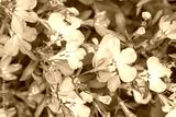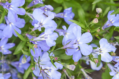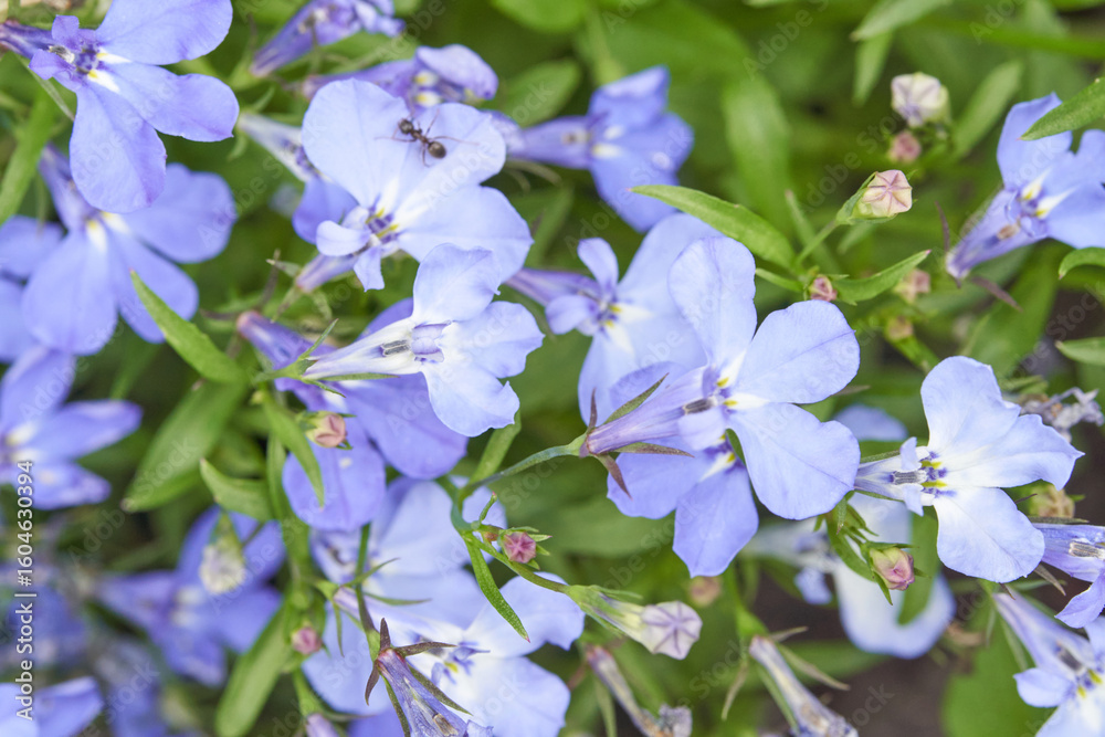Close up of delicate light blue lobelia flowers with green leaves and small ants in a garden setting.