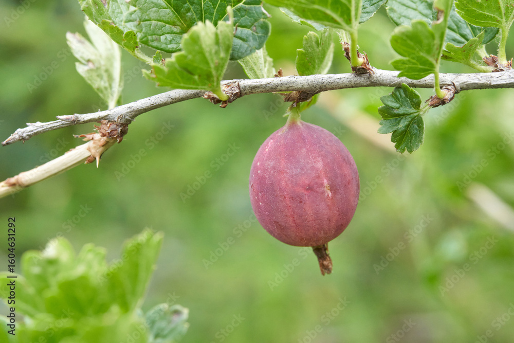 Ripe red gooseberry on branch with green leaves in natural outdoor setting.
