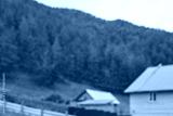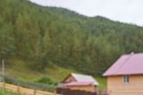 Blurred scenic view of rustic wooden houses near forest on hillside.