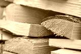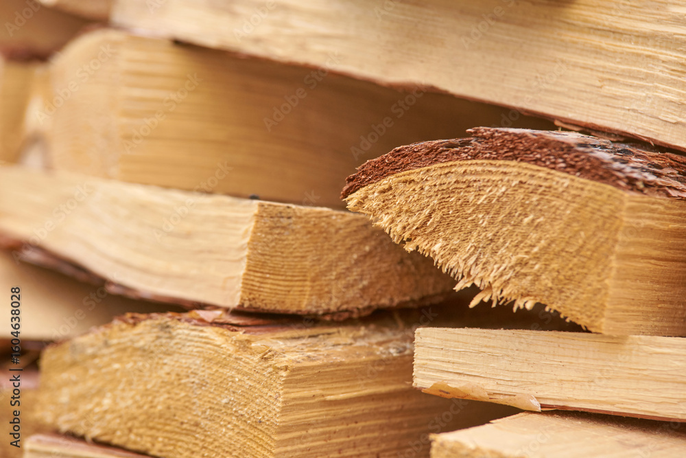 Close up view of stacked firewood with natural wood texture and rough edges in warm light.