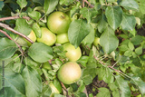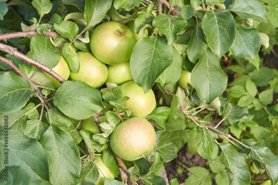 Bunch of green apples hanging on a tree branch with lush leaves in a sunny orchard.