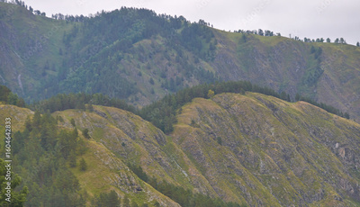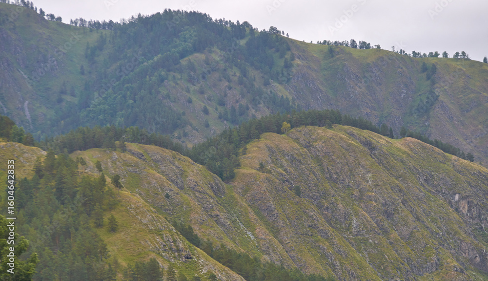 Lush green hills with dense forest and cloudy sky in mountainous landscape.