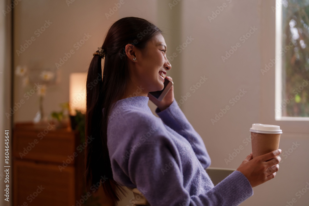 Asian adult woman talking mobile phone holding coffee cup enjoying relaxed conversation at cozy home setting