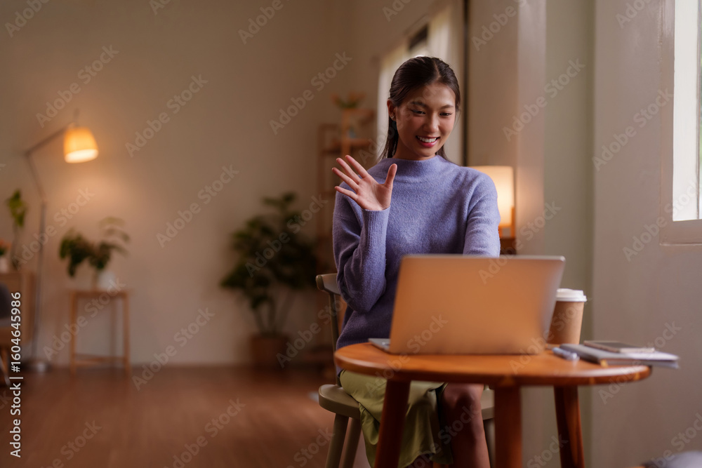 Asian woman video conferencing home office laptop computer online meeting virtual connection digital communication remote work happy lifestyle
