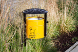 Yellow Dog Waste Bin with Polish Text in Ornamental Grass | Żółty kosz na psie odchody z grafiką psa i napisem "Posprzątaj po mnie"