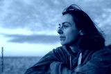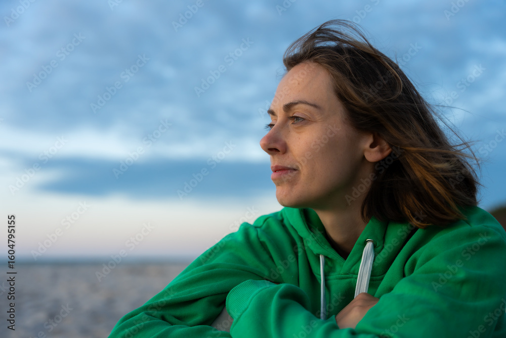 Pensive woman in green hoodie gazing at horizon on beach at dusk, thoughtful expression and natural mood