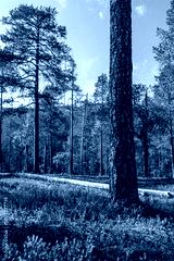 Sunny summer forest with a walking path through green undergrowth and tall pine trees