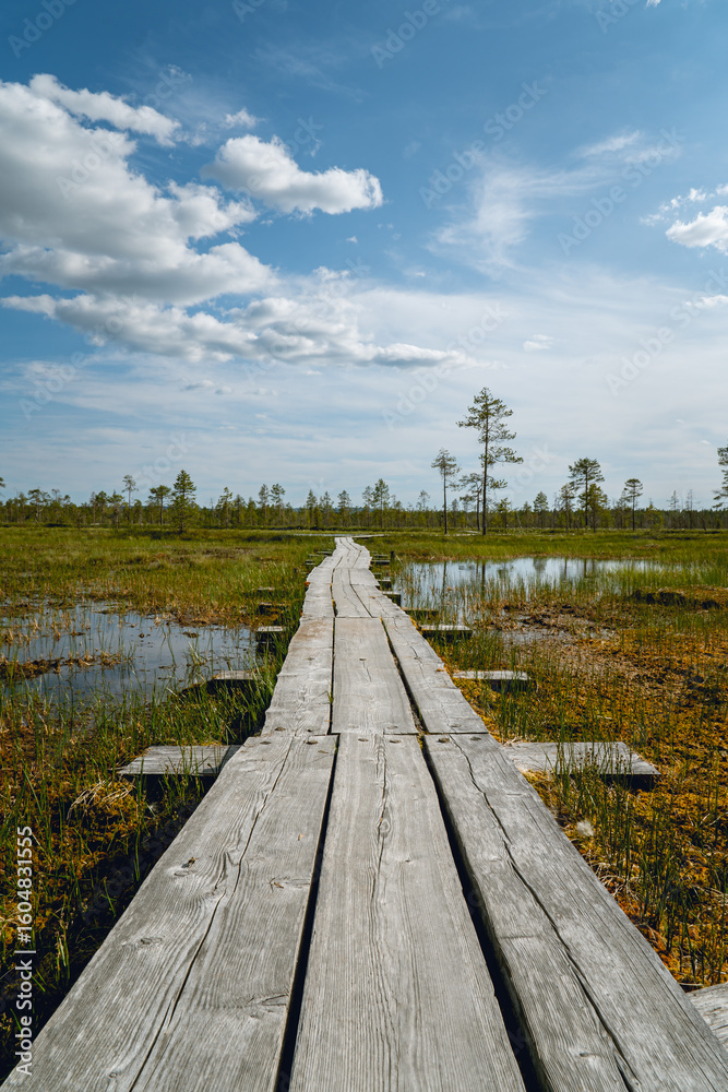 Wooden Boardwalk Through a Lush Green Bog Under a Bright Blue Sky