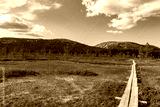 Scenic boardwalk traverses expansive northern landscape under a bright blue sky