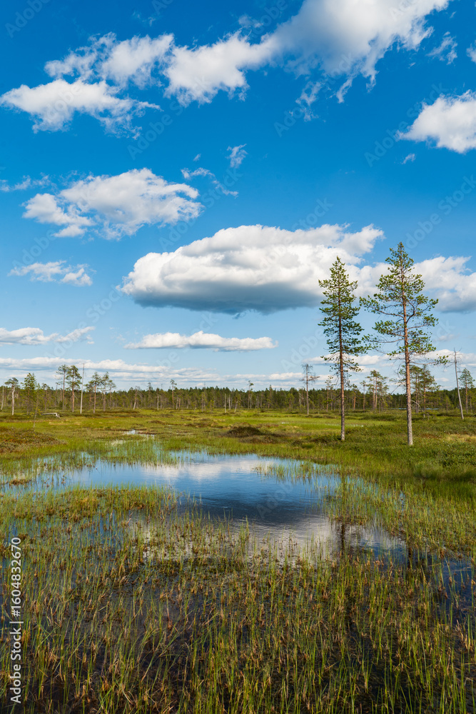 Vast Bog Landscape Under a Bright Blue Sky with Fluffy White Clouds and Reflective Puddles