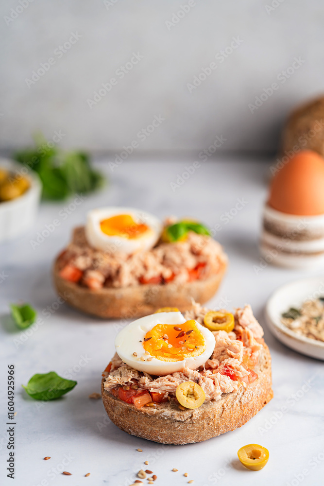 Tuna toast. Open sandwiches with whole grain bread, canned tuna, boiled egg, tomatoes and olives on white background. Healthy breakfast food