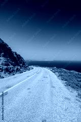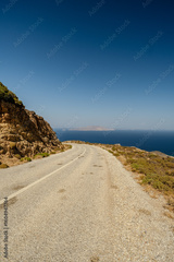 View of a lonely road and the Aegean Sea in the background in Ios Greece