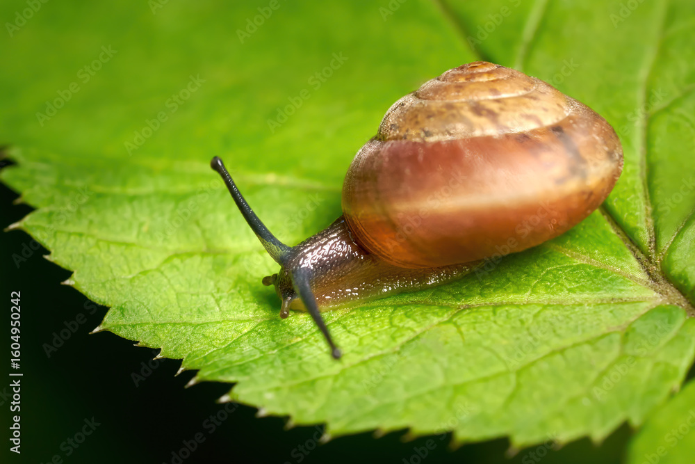 Schnecke mit braunem Schneckenhaus auf einem grünen Blatt