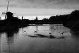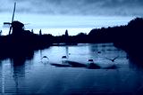 Scenic view of lake against sky during sunset with silhouette windmill against romantic sky