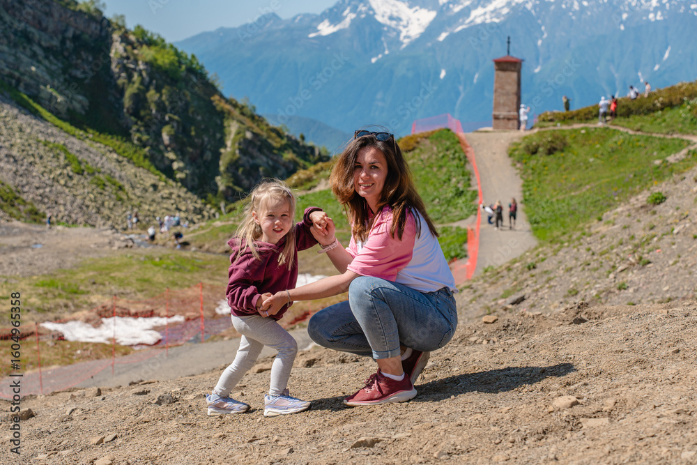 A young mother with her three-year-old child daughter goes to the mountains on Krasnaya Polyana in Sochi in the summer. The concept of tourism, family holidays