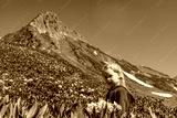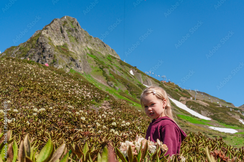 Cute child girl tourist in the mountains collects wildflowers in Krasnaya Polyana in Sochi.