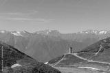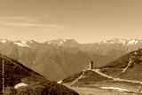 Gorgeous landscape in the mountains with snow-capped hills and clouds over the peaks of the mountains, Krasnaya Polyana. Sochi, Russia - 8 June 2025
