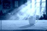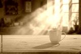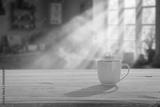Cup on wooden table in bright kitchen interior with natural sunlight streaming through the window. Soft, cozy atmosphere, welcoming home space for placing a product or food display.
