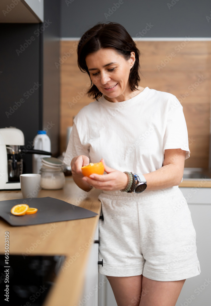 Woman Slicing A Fresh Orange For Breakfast In The Kitchen