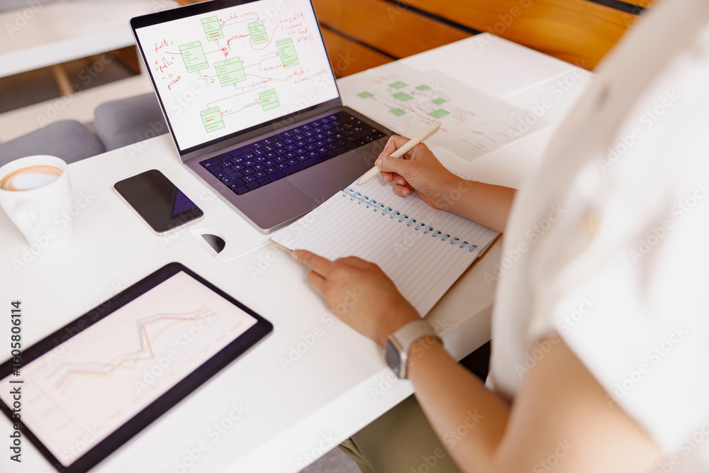 An organized and professional workspace that includes a laptop, notes, and data analytics to enhance productivity