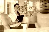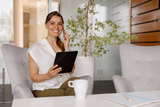 A cheerful woman is engaged in a lively phone call while comfortably using a tablet in a bright office space