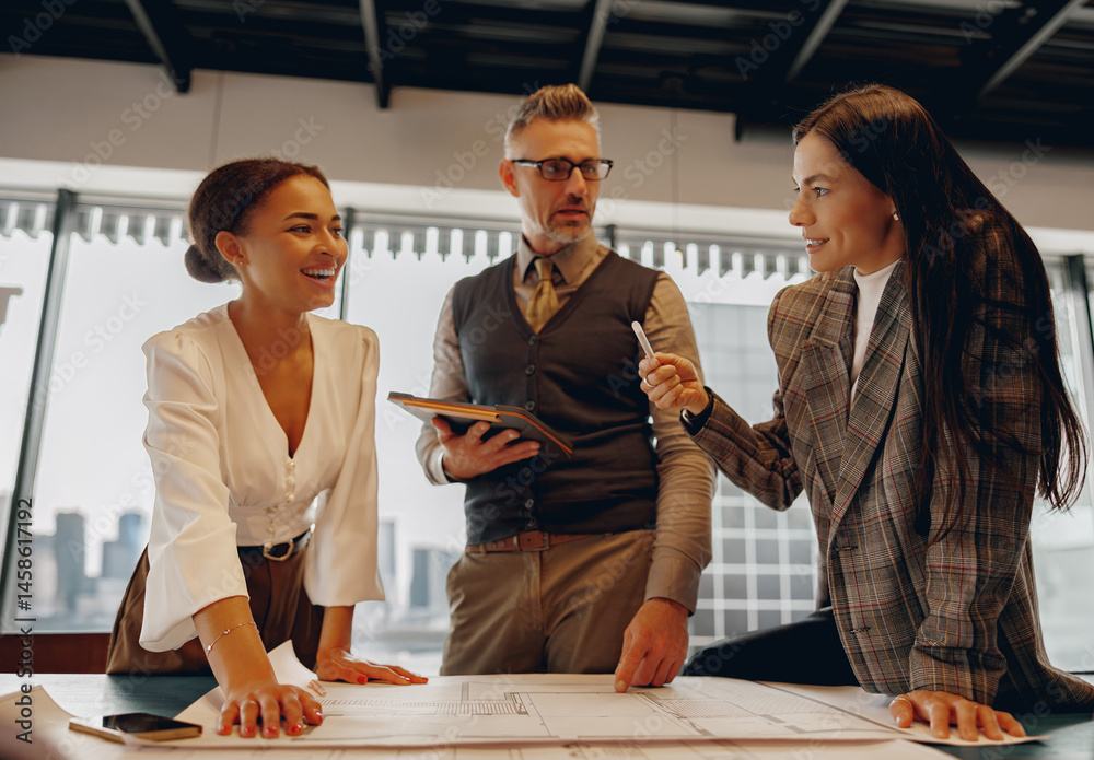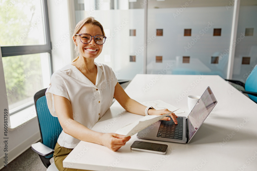 A smiling woman engages with her laptop while seated at a conference table, showcasing a vibrant workspace.