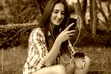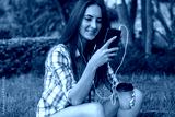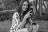 Attractive young woman in headphones listening to music using a smartphone and drinking coffee while sitting on curb outdoors in the city center