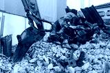 Demolition site with excavator and rubble