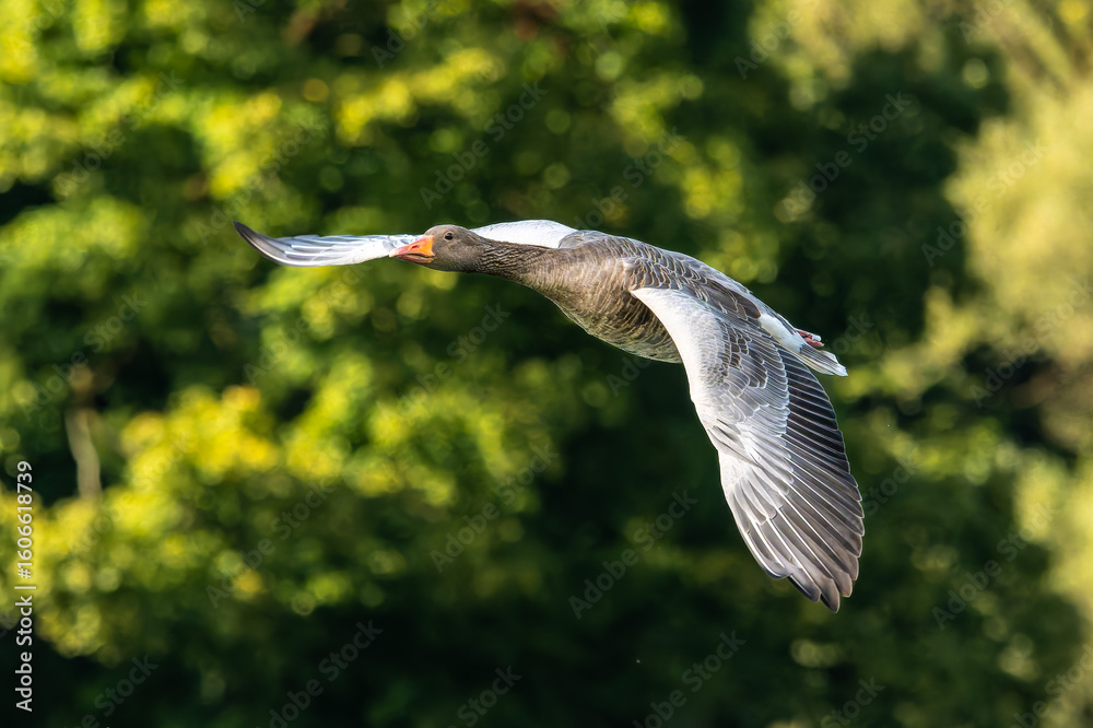 The flying greylag goose, Anser anser is a species of large goose