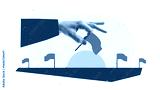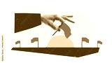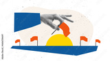 Creative digital collage of large hand placing red flag at final point of progress road. Concept of planning milestone, goal tracking, business consulting, and timeline visualization.