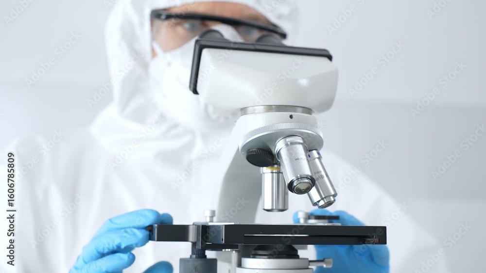 Medical virologist in a hazmat suit, mask, and blue protective gloves, carefully working at a microscope in a laboratory researching viruses. Healthcare and science concept