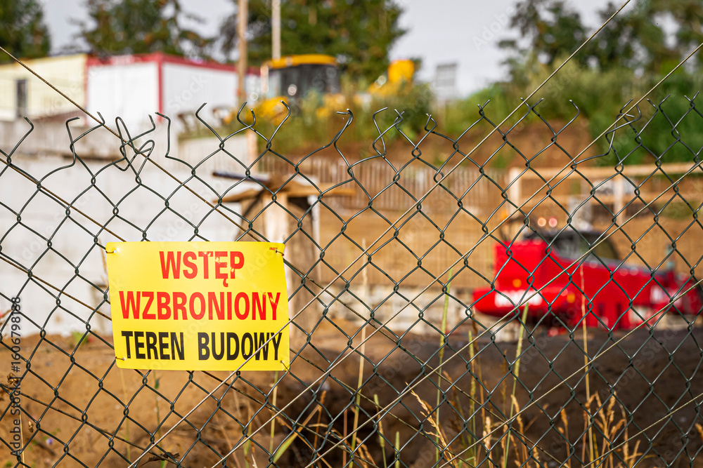 Polish Construction Site Warning Sign Behind a Fence | Znak ostrzegawczy na placu budowy na ogrodzeniu