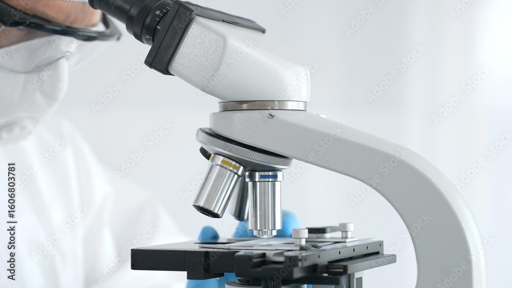Medical virologist in a hazmat suit, mask, and blue gloves, diligently working at a microscope in a laboratory researching viruses. Healthcare, medicine, and science concept