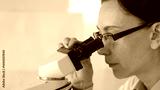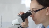Female researcher focusing on a microscope lens, analyzing scientific samples in a sterile lab for medical innovations. Medicine and science concept