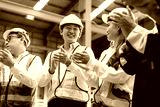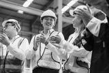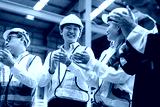 Diverse factory employees wearing protective gear celebrating together at indoor warehouse location. Emotion of unity and recognition boosts workplace morale.