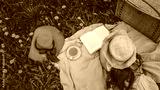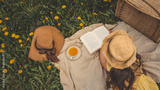 Girl in straw hat reading a book on a picnic blanket among dandelions, with a cup of tea, woven basket, and sun hat beside her. Peaceful summer scene in the meadow