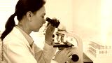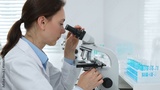 Female scientist examining microscope slide, analyzing chemical sample in sterile laboratory environment, performing precision medical research. Medicine and science concept