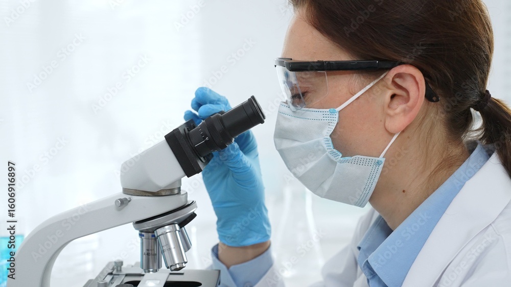 Female scientist wearing a mask and protective glasses using a microscope in a laboratory setting, conducting scientific research and analysis. Medicine, healthcare and science concept