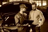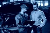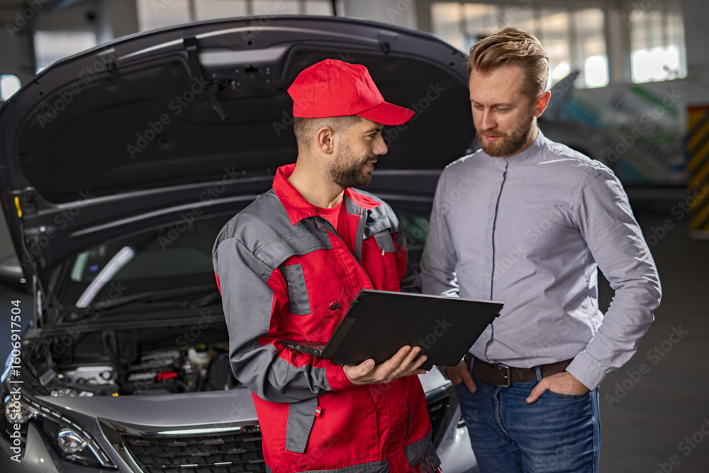 A mechanic in uniform shows a customer vehicle repair details on a tablet in the workshop.