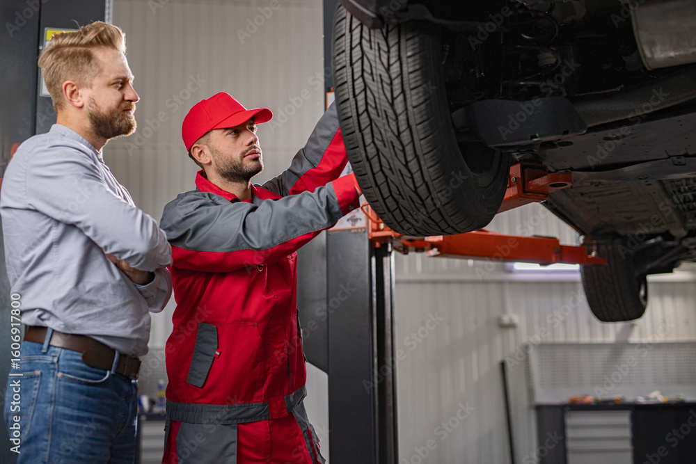 A car mechanic and a customer are inspecting a vehicle in a professional auto shop. The mechanic explains repair details while showing car parts to the attentive customer.