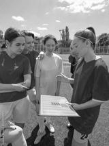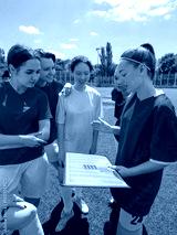 Female soccer team planning on athletic field beneath sunny sky. Concept of strategic planning and game readiness, tactical board discussion, leadership in sports.