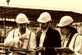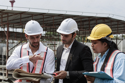 Team of engineers reviewing construction documents and plans on site. Surrounded by concrete panels and heavy machinery, they demonstrate teamwork and coordination in a real industrial setting.
