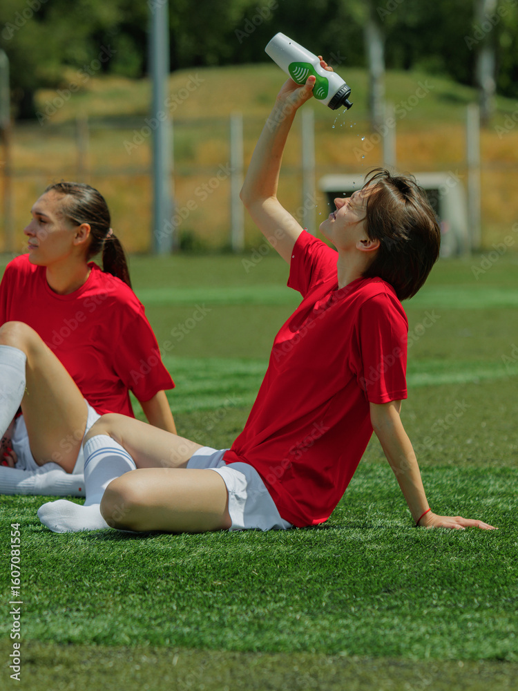 Female football players resting and hydrating on green soccer field. Concept of rehydration and body care, post-match rest under sunlight, promoting positive sports routines and lifestyle.