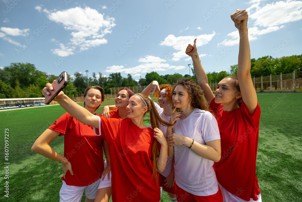 Women football team celebrating with a selfie on a sunny field. Concept of team spirit, sport motivation posters and youth campaigns, youth group identity