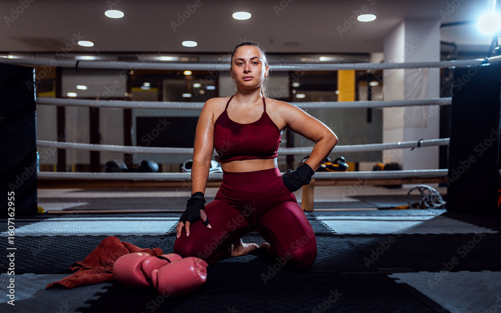 Tired female boxer sitting boxing ring resting after training looking at camera.