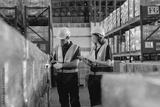 Male and female warehouse workers scanning barcode and verifying auto parts with clipboard, showing teamwork and accuracy in smart automotive logistics process, Auto parts logistics and transport