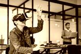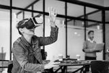 young hispanic woman using virtual reality glasses at office in Mexico Latin America, latin people and teamwork working together in vr technology