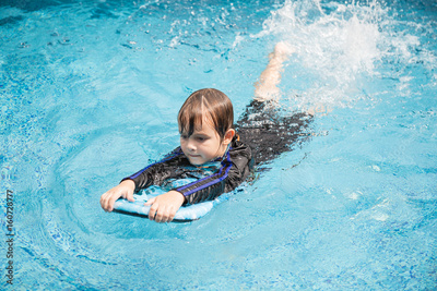 Boy playing in outdoor swimming pool,Kids learn to swim.