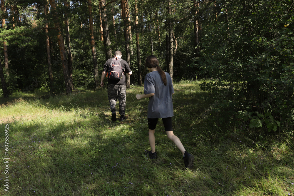 Father and daughter walking slowly through sunlit forest, scanning the ground while foraging for wild mushrooms, enjoying quiet bonding and nature exploration.