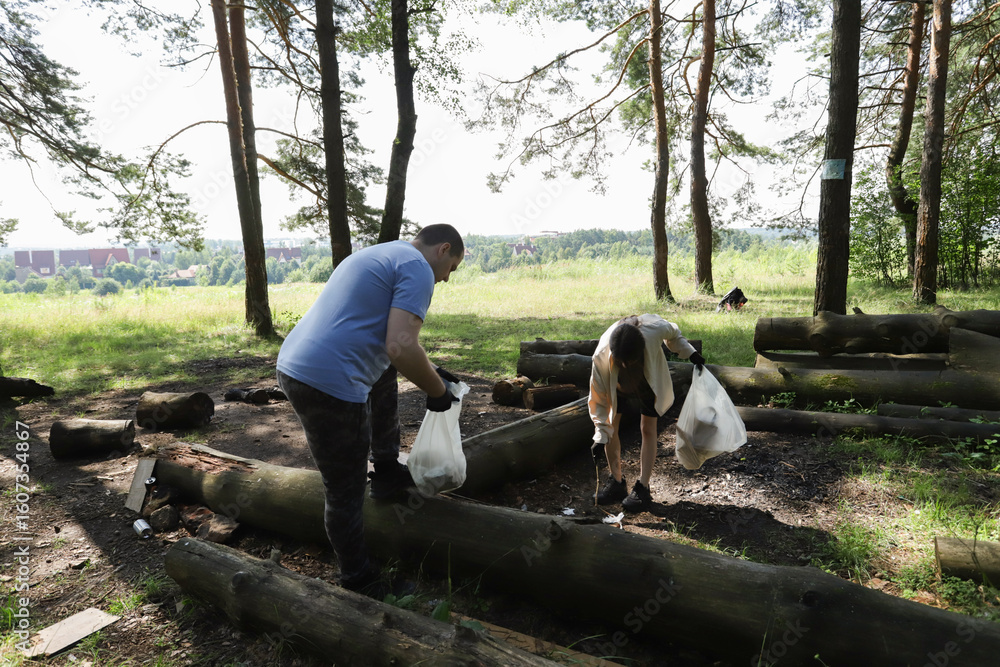Man and young girl involved in forest preservation, encouraging family participation in green causes, collecting litter at former campfire site, promoting healthy lifestyle and eco-education.